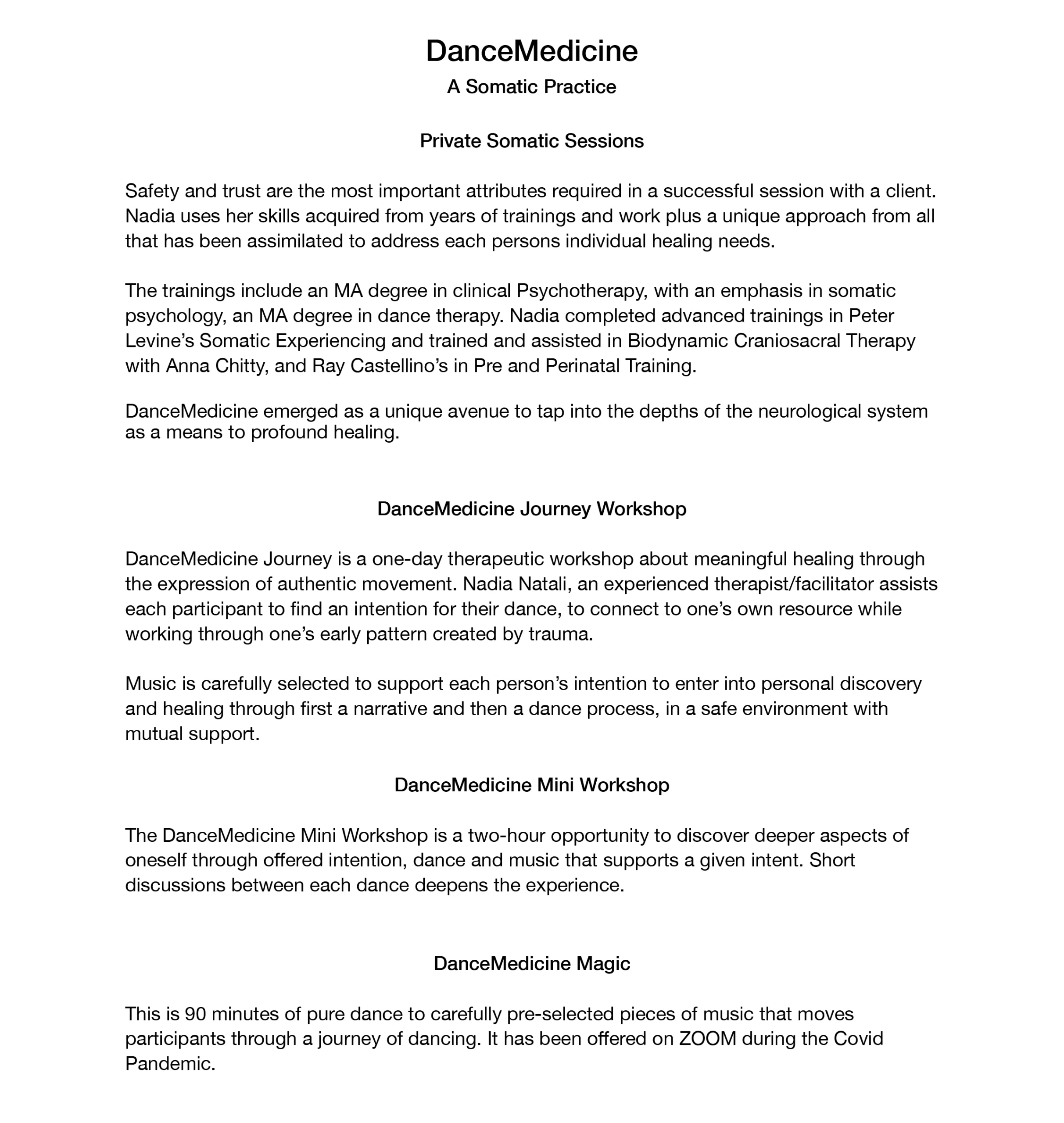 Nadia Natali is a clinical psychotherapist, a dance therapist, a Somatic Experiencing Practitioner and a craniosacral therapist who specializes in treating trauma.